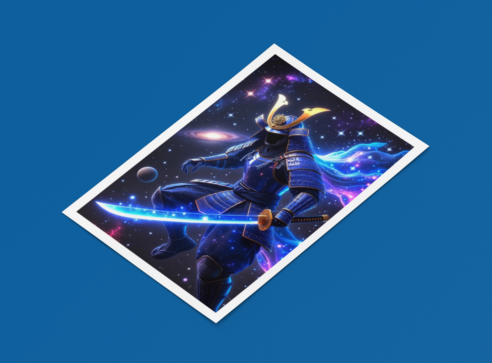 A lone samurai forged from starlight and destiny roams the galaxies, his blade infused with cosmic energy. Draped in celestial armor, he walks between worlds. A silent guardian born from the heart of the universe itself.